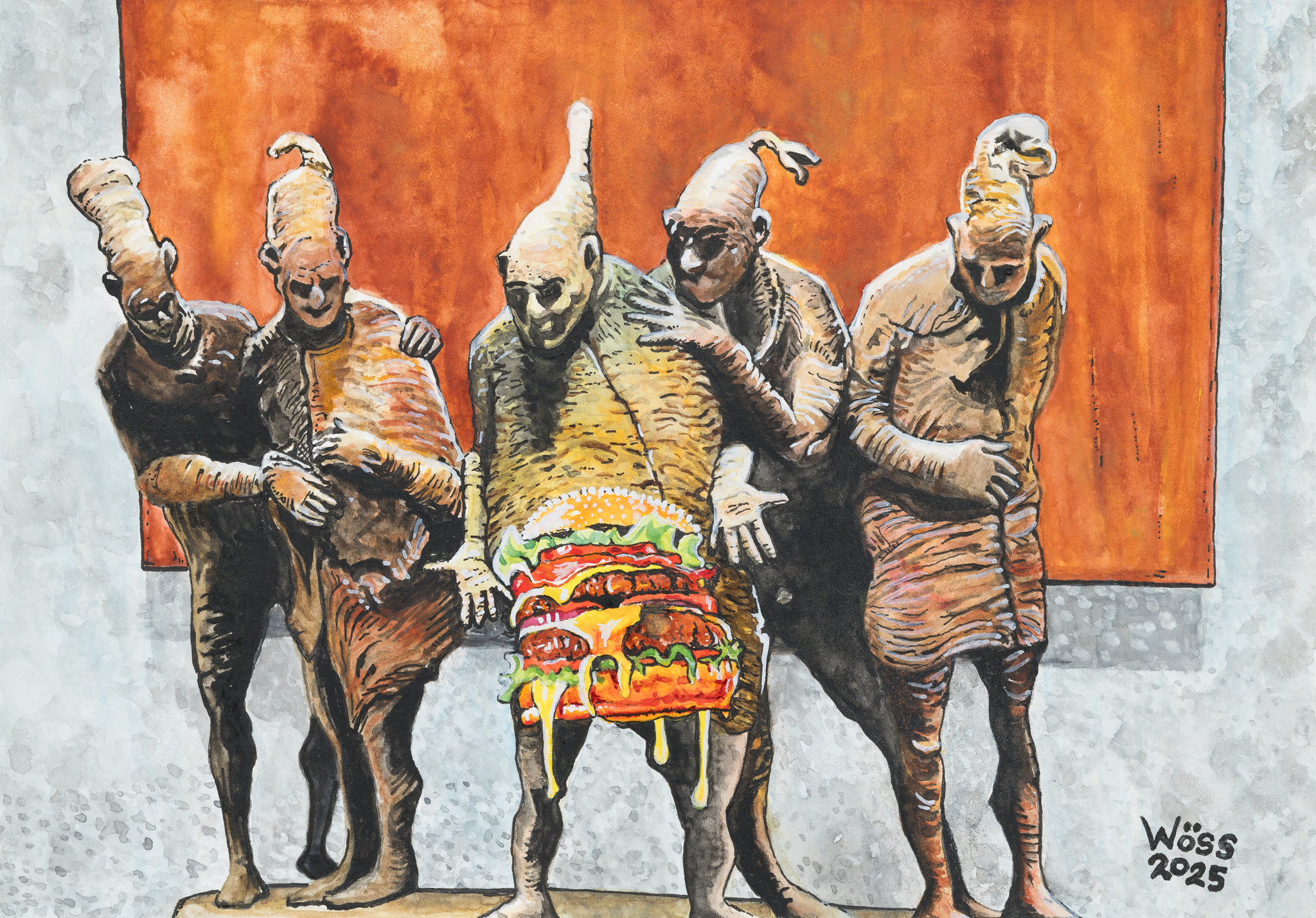 Die Ausstellung führt mitten hinein in die vielschichtige Bilderwelt von Wolfgang Wöß. Zwischen spielerischer Fiktion, feinem Humor und leiser Kritik entstehen Werke, die farbige Comic-Anklänge mit markanten Schwarz-Weiß-Kontrasten verbinden.
