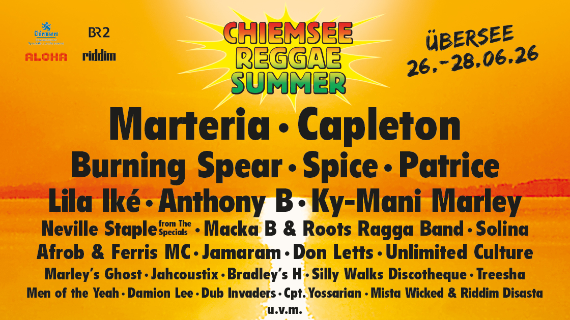 Nach zehn Jahren kehrt das legendäre Chiemsee Reggae Summer Festival vom 26. bis 28. Juni 2026 nach Übersee am Chiemsee zurück. Vor der traumhaften Kulisse der Chiemgauer Alpen werden am letzten Juniwochenende 2026 zahlreiche nationale und internationale Künstler:innen auf zwei Bühnen ihre Botschaften von Love, Peace & Unity verbreiten. Musikalisch liegt der Schwerpunkt wieder bei Reggae, Dancehall und Hip Hop und Insgesamt werden über 30 Künstler:innen beim Chiemsee Reggae Summer auftreten. Als Headliner konnten Marteria & Capleton gewonnen werden. Weiterhin sind dabei: Anthony B, Lila Iké, Macka B & Roots Ragga Band, Afrob & Ferris MC, Silly Walks Discotheque, Treesha, Men of the Yeah, Unlimited Culture, Monkey Beach, Patrice, Neville Staple from The Specials, Jamaram, Marley’s Ghost, Jahcoustix, Don Letts, Solina und Damion Lee.