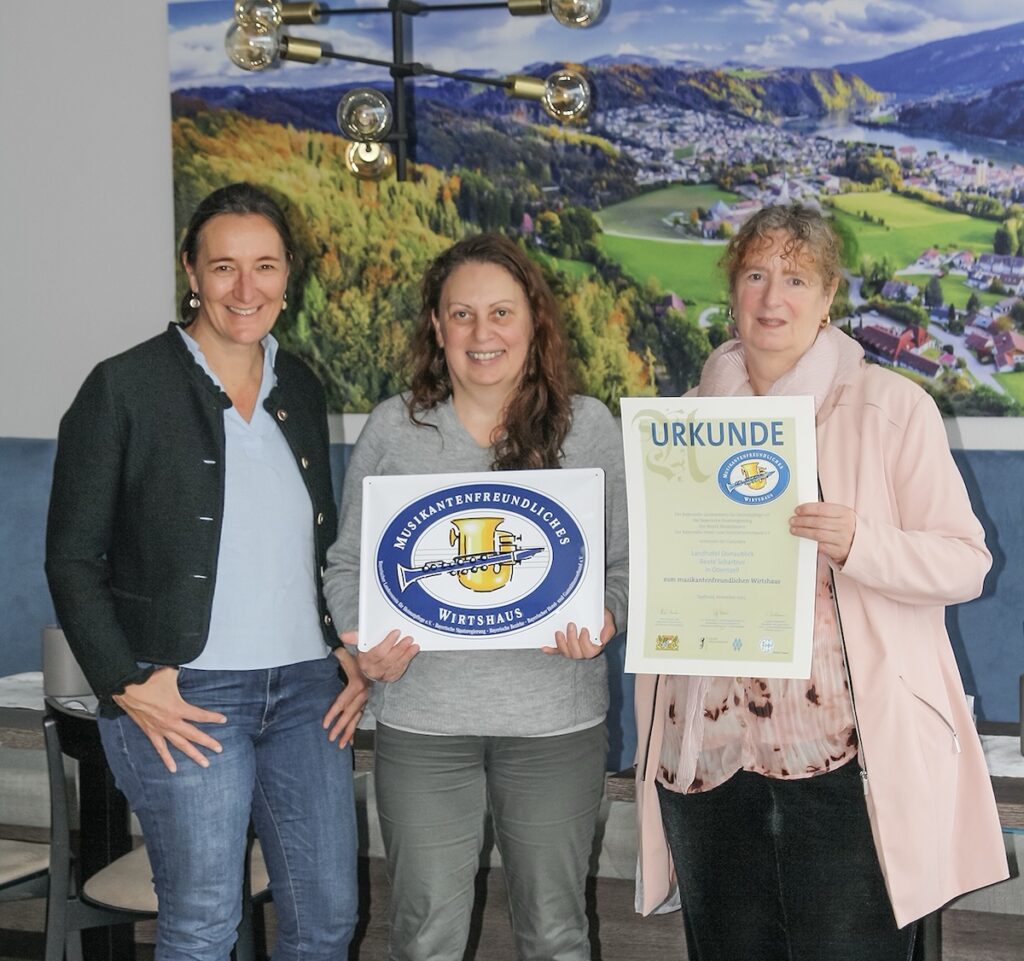 Kürzlich wurde auch das Landhotel Donaublick in Obernzell in den Kreis der neuen musikantenfreundlichen Wirtshäuser mit aufgenommen. Es heißt Musikantinnen und Musikanten, Sängerinnen und Sänger willkommen, so wie es bereits mehrere hundert Gaststätten in ganz Bayern tun. 26 bayerische Wirtshäuser wurden heuer durch Heimatminister Albert Füracker neu ausgezeichnet, darunter vier aus Niederbayern. Veranstalter der Aktion sind die Bayerischen Bezirke, der Bayerische Landesverein für Heimatpflege e.V., DEHOGA Bayern und das Staatsministerium der Finanzen und für Heimat. Interessierte Wirtshäuser aus Niederbayern, die sich künftig beteiligen möchten, können beim Kulturreferat des Bezirks Niederbayern, kultur@bezirk-niederbayern.de, und unter www.musikantenfreundlicheswirtshaus.de weitere Informationen zum Projekt erhalten.