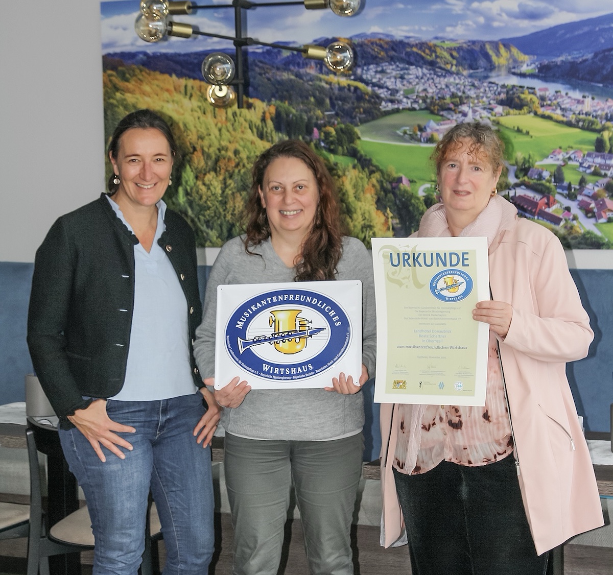 Beate Schartner (Mitte), Wirtin des Landhotels Donaublick, erhält von Veronika Keglmaier (l., Bezirk Niederbayern/Kultur) und Rita Mautz (r., DEHOGA Niederbayern) Urkunde und Plakette mit dem Logo der Aktion, das von weither signalisiert: Hier sind Sänger und Musikanten willkommen! - © Bezirk Niederbayern, Kulturreferat